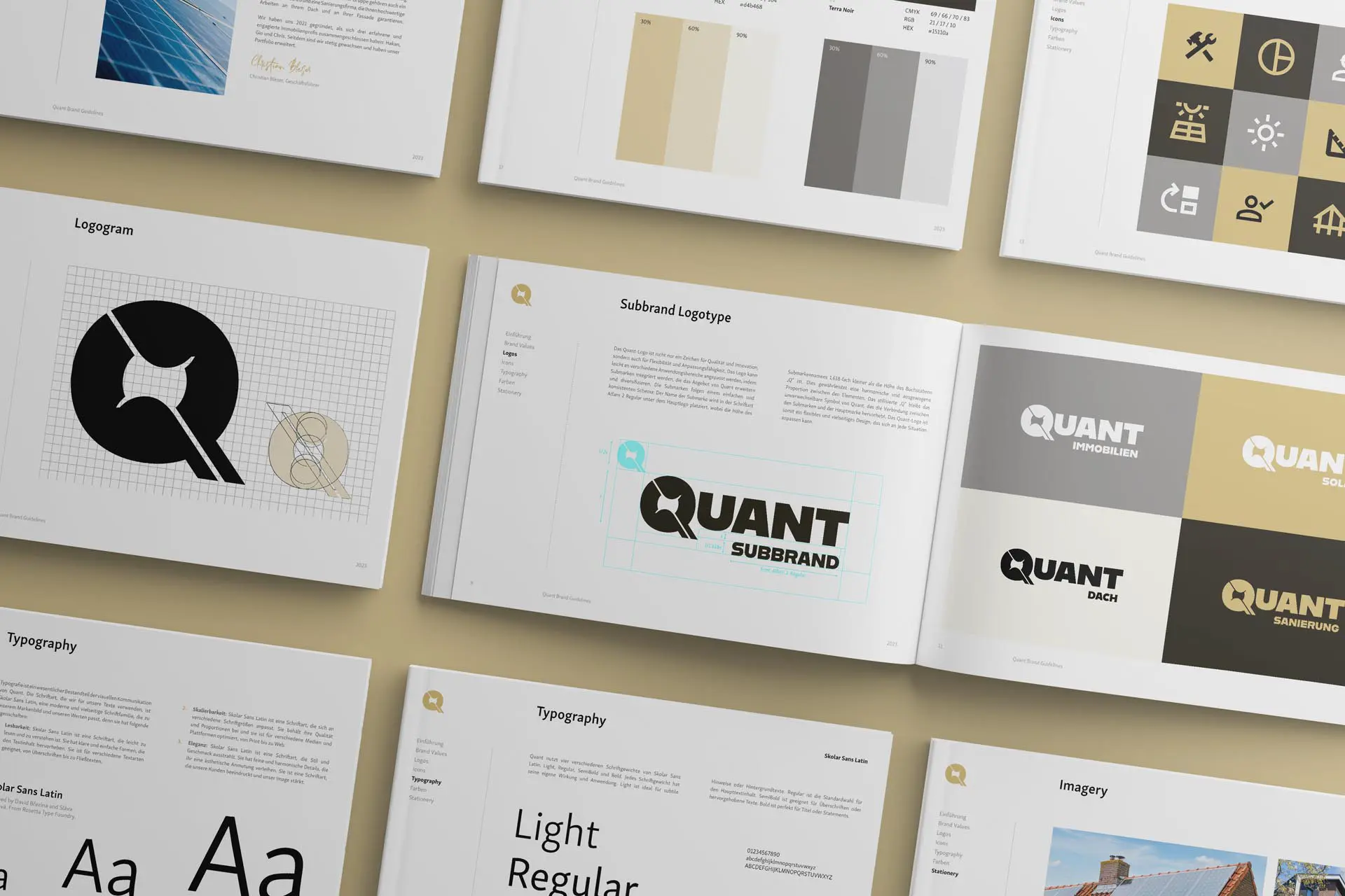 The design process focused on creating a cohesive visual identity that could be seamlessly applied across Quant and its sub-brands. The primary logo was redesigned with a bold, modern typeface and a creatively modified "Q" that symbolized innovation and flexibility. A set of brand guidelines was developed, covering logo usage, typography, colors, and brand values. The guidelines specified how sub-brands would be visually represented, using a consistent layout where sub-brand names are positioned under the main Quant logo in a specific proportional size, ensuring a balanced and unified look. Typography was carefully selected, with Skolar Sans Latin chosen for its readability, elegance, and scalability across various platforms. Color choices, including Terra Gold and Terra Noir, were strategically picked to convey optimism, creativity, and professionalism.